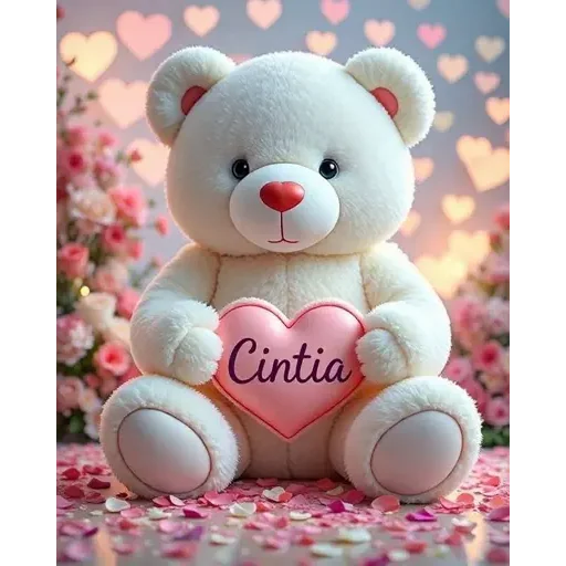 Um ursinho de pelúcia branco com um coração rosa que tem o nome 'Cintia' escrito nele, sentado em um fundo de flores e corações.