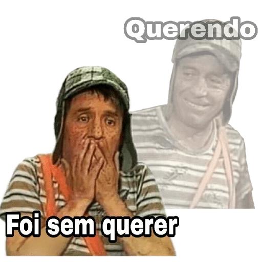 Um homem com camisa listrada e capuz aparece com as mãos na frente da boca, surpreso. Ele está em primeiro plano, enquanto uma versão esmaecida dele mesmo sorrindo aparece ao fundo. As frases 'Querendo' e 'Foi sem querer' aparecem na imagem.