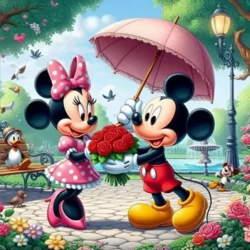 Mickey e Minnie Mouse caminhando em um parque, ele segurando um guarda-chuva rosa e oferecendo flores para ela.