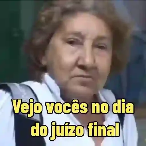 Uma mulher mais velha com expressão séria e cabelos castanhos, vestindo uma camisa branca com suspensórios pretos, olhando para frente com uma cara de desaprovação. O texto 'Vejo vocês no dia do juízo final' aparece em amarelo na parte inferior.