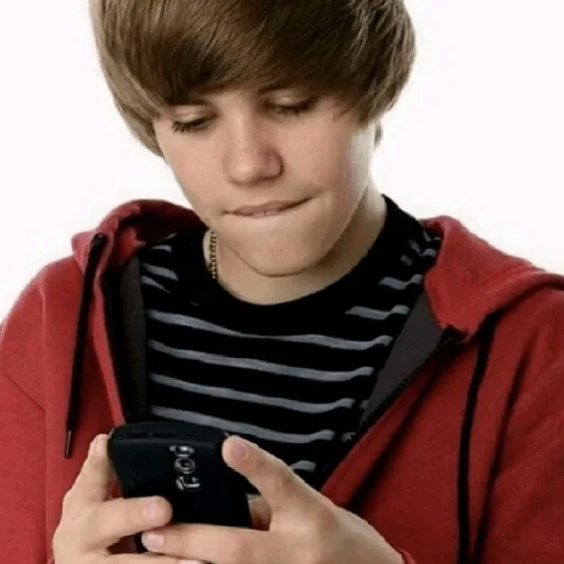 Um jovem com cabelos castanhos e um casaco vermelho olha para baixo enquanto segura um celular.