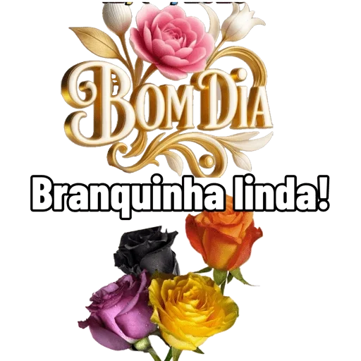 Um desenho de rosas coloridas com o texto 'Bom Dia' em letras douradas e 'Branquinha linda!' em letras brancas.