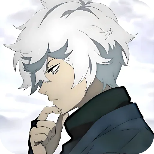 Personagem de anime com cabelo branco e expressão pensativa, usando um casaco escuro. Ele está com a mão no queixo e olhar sério.
