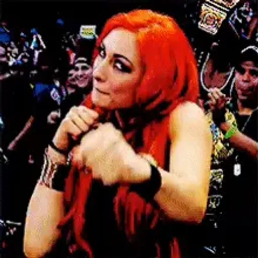 Mulher com cabelo preto e maquiagem pesada em um evento lotado, possivelmente um ringue de luta livre, com o texto…