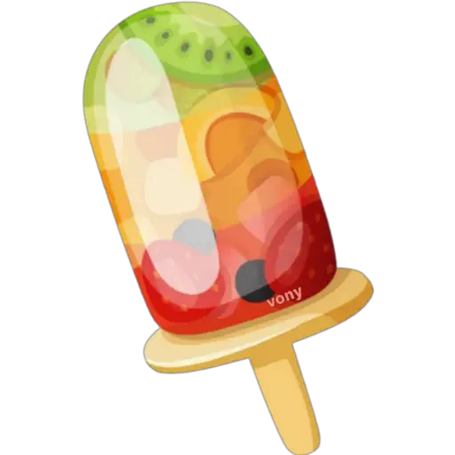 Um sorvete colorido com várias frutas, incluindo kiwi, laranja e outras, em um palito de madeira.