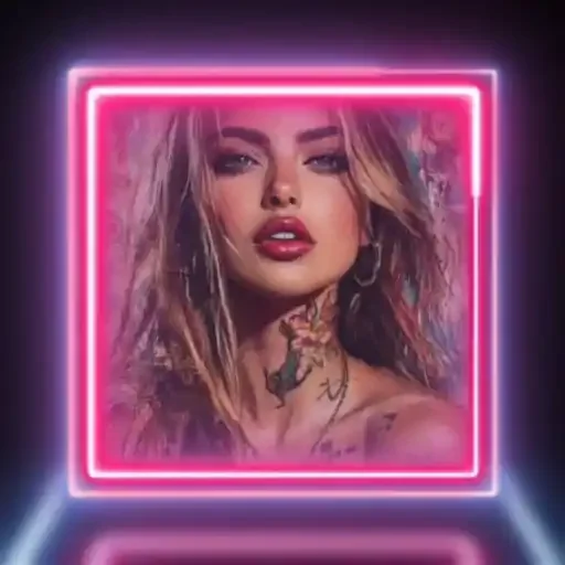 Rosto de uma mulher com lábios vermelhos e olhos escuros, cercado por um retângulo rosa com contorno de neon. Ela tem uma tatuagem no pescoço.