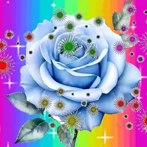 Uma rosa azul com folhas verdes em um fundo arco-íris, decorada com pequenas flores e faíscas.