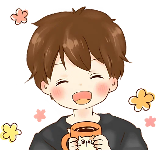 Menino de cabelo castanho sorrindo com um bule de chá, rodeado de flores.