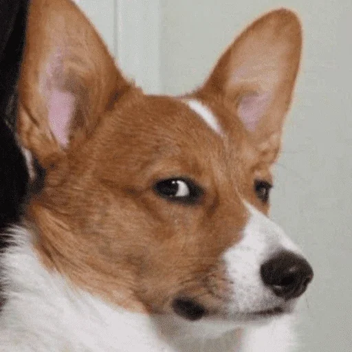 Rosto de um cachorro corgi com pelagem castanha e branca, orelhas grandes e focinho preto.