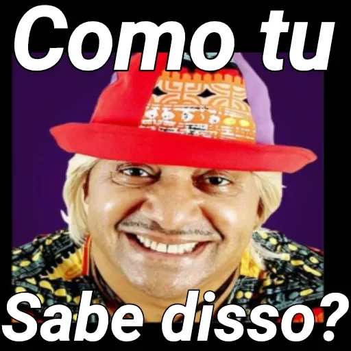 Um homem mais velho com cabelos loiros, usando um chapéu vermelho com uma faixa colorida, sorrindo com a frase 'Como tu sabe disso?'