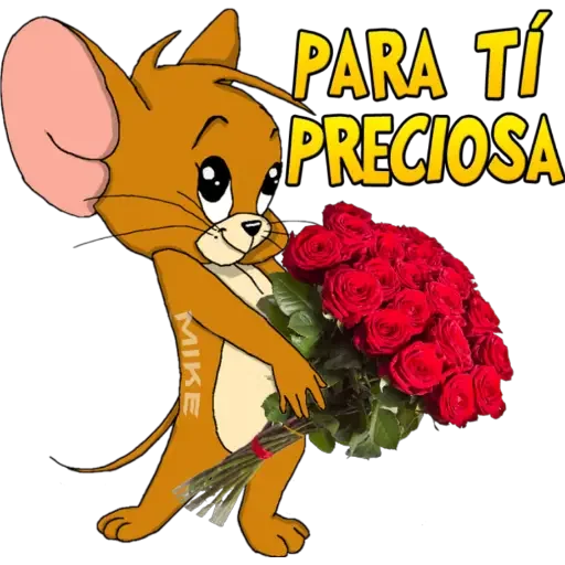 Um rato cartoon com orelha grande e olhos expressivos segura um buquê de rosas vermelhas e diz 'PARA TÍ PRECIOSA'.