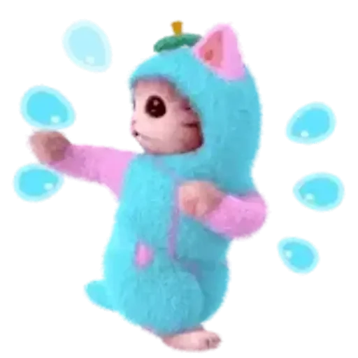 Gatinho vestido com um macacão azul com capuz com orelhas de gato rosa e bolhas azuis ao redor.