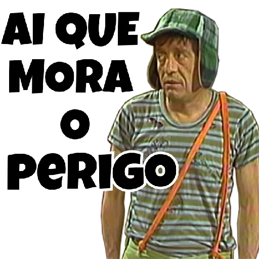 Um homem com uma camisa listrada verde e branca e um chapéu, com uma expressão séria, ao lado do texto 'AI QUE MORA O PERIGO'.