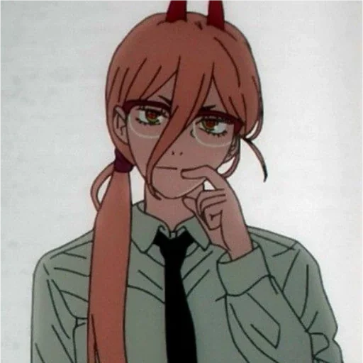 Uma garota com cabelo laranja e chifres vermelhos, vestindo uma camisa cinza e gravata preta, com uma expressão pensativa e o dedo no queixo.