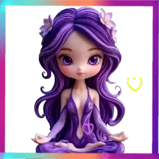 Uma menina de olhos roxos e cabelos longos e roxos sentada em posição de meditação, vestindo uma roupa roxa e com flores no cabelo.