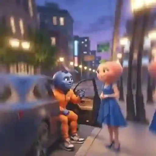 Um personagem azul e laranja sentado em um carro conversando com uma menina de vestido azul em uma rua noturna.