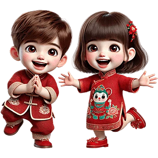 Dois personagens de anime infantil, um menino e uma menina, vestidos com roupas vermelhas tradicionais chinesas com…