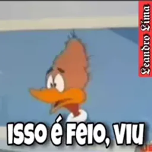 Um desenho do Woody Woodpecker com expressão de desaprovação, vestindo um terno azul e branco, com o texto "Esse aí não…