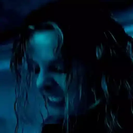 Rosto de vampiro com olhos claros e presas, mostrando um olhar assustador com sangue na boca.
