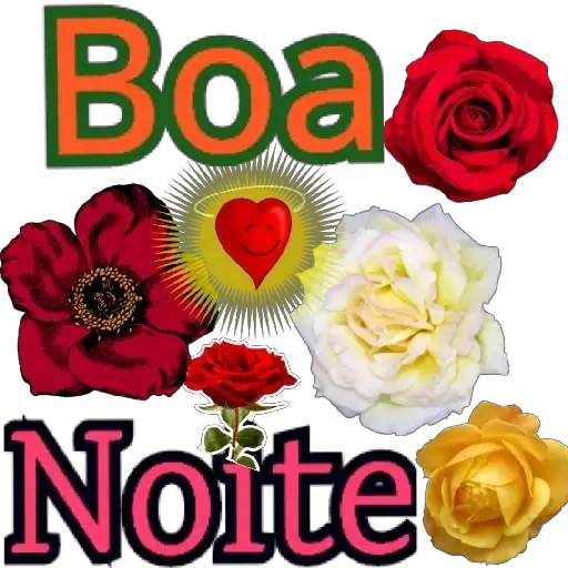 Flores coloridas, incluindo rosas vermelhas, brancas e amarelas, com o texto 'Boa Noite' em letras grandes.