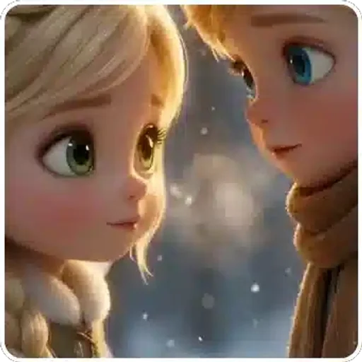 Dois personagens de Frozen, uma menina loira com trança e um menino ruivo com cachecol, olhando um para o outro com expressões doces.