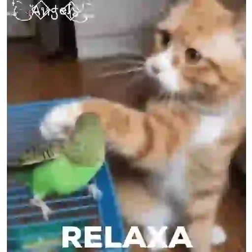 Gato laranja com pata estendida em direção a um periquito verde em uma gaiola azul, com a palavra 'RELAXA' em letras brancas na parte inferior.