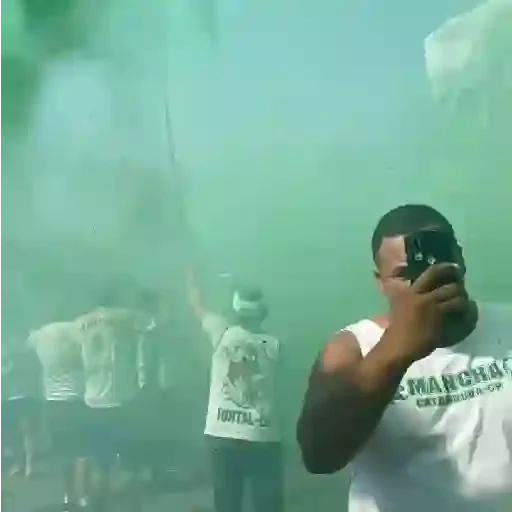 Homem tirando foto em meio a uma multidão com fumaça verde, usando uma camiseta branca com texto.