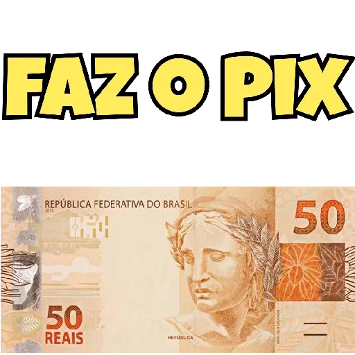 Uma nota de 50 reais com a frase 'FAZ O PIX' em letras grandes e amarelas por cima.