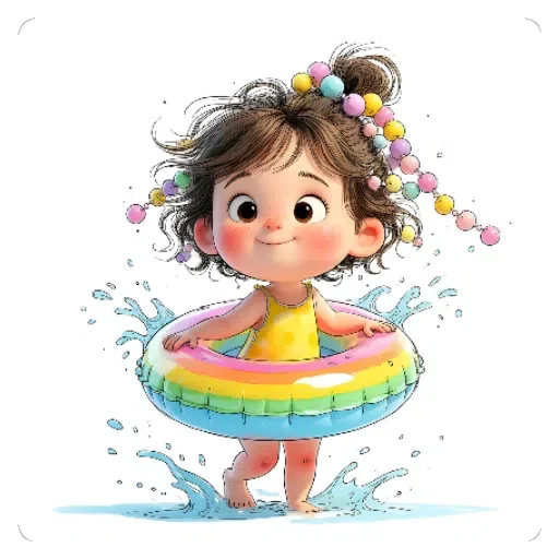 Menina com cabelo castanho e faixa de bolinhas coloridas, usando um colete salva-vidas colorido, com água respingando ao redor.