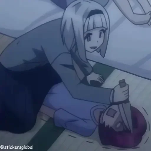 Uma garota de cabelos prateados e bangs está ajoelhada no chão, olhando para um celular com uma expressão surpresa, enquanto segura a cabeça de outra pessoa.