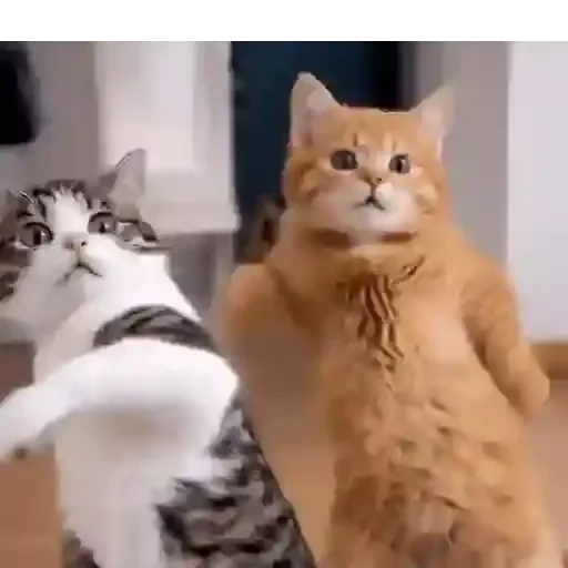 Dois gatos, um laranja e um cinza e branco, estão em pé sobre as patas traseiras, olhando para frente com expressões curiosas.