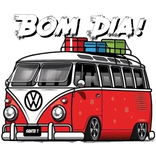 Um ônibus VW colorido com malas no teto e o texto 'BOM DIA!' em letras grandes acima.