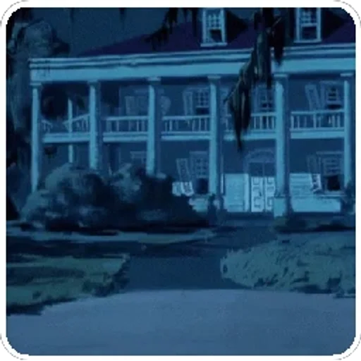 Uma casa grande e antiga com varanda e colunas, em tons de azul escuro.
