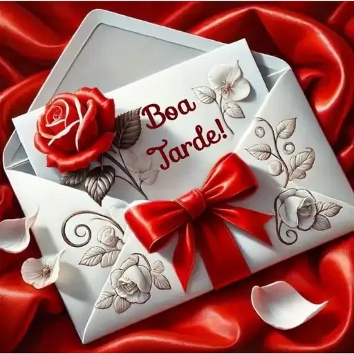 Um envelope branco com um laço vermelho e uma rosa vermelha, contendo um cartão com a mensagem 'Boa Tarde!' em letras vermelhas.