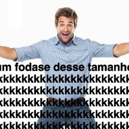 Um homem com camisa azul e braços abertos, com texto 'm fodase desse tamanh kkkkkkkkkkkkkkkkkkkkkkkkkkkkkkkkkkkkkkkkkk'