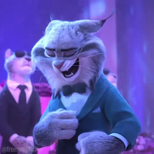Um lobo cinza com um sorriso largo e olhos semicerrados, usando um blazer azul e gravata borboleta preta, com outros lobos ao fundo.