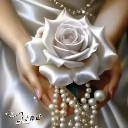 Uma rosa branca sendo segurada por mãos, decorada com pérolas. A rosa e as pérolas têm tons de branco e creme.