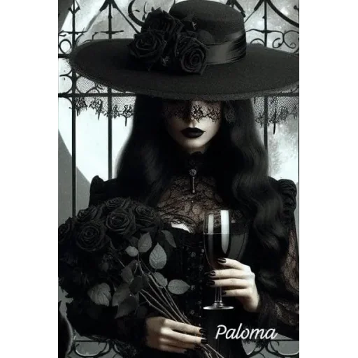 Mulher elegante com chapéu preto e máscara, segurando um copo de champanhe e um leque, com o nome 'Paloma' na parte inferior.