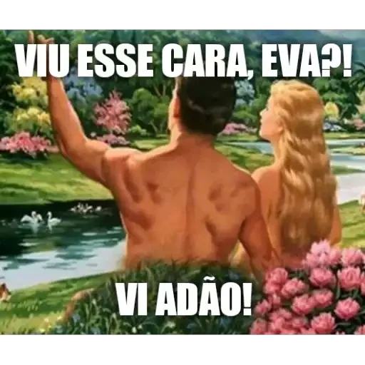 Um casal, Adão e Eva, em um cenário paradisíaco com um lago e flores, Adão apontando para algo. O texto 'VIU ESSE CARA, EVA?! VI ADÃO!' está sobreposto.