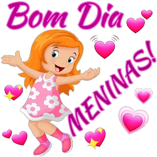Menina de cabelo laranja em vestido rosa com flores brancas, sorrindo e com os braços abertos, rodeada de corações rosa e texto 'Bom Dia MENINAS!'.