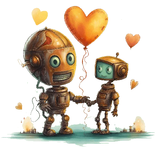 Dois robôs de metal com expressões felizes segurando uma mão do outro, com um balão em forma de coração laranja e pequenos corações ao redor.