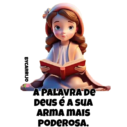 Menina sentada com um livro, vestindo uma roupa clara e um chapéu. A frase 'A PALAVRA DE DEUS É A SUA ARMA MAIS PODEROSA.' aparece abaixo dela.