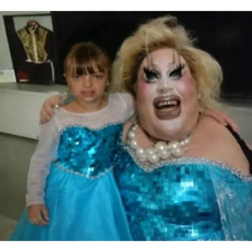 Uma criança e uma pessoa adulta, ambos vestidos com vestidos azuis, posam para uma foto. A pessoa adulta está com maquiagem exagerada e um colar de pérolas.