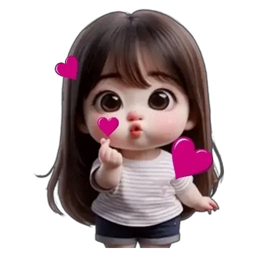Menina de cabelos castanhos com dois corações rosa, um na bochecha e outro na mão, fazendo um gesto de amor.
