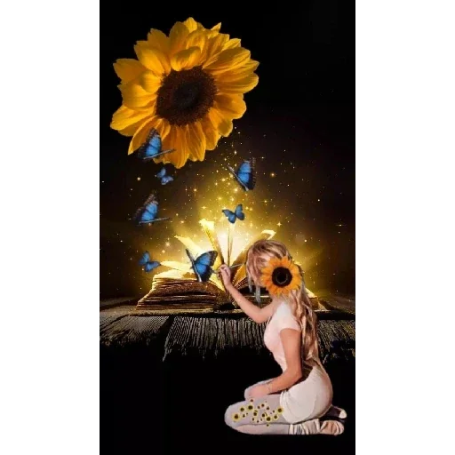 Uma menina sentada com uma flor de girassol na mão e outra no rosto, com borboletas azuis saindo de um livro em chamas ao fundo, contra um fundo escuro.