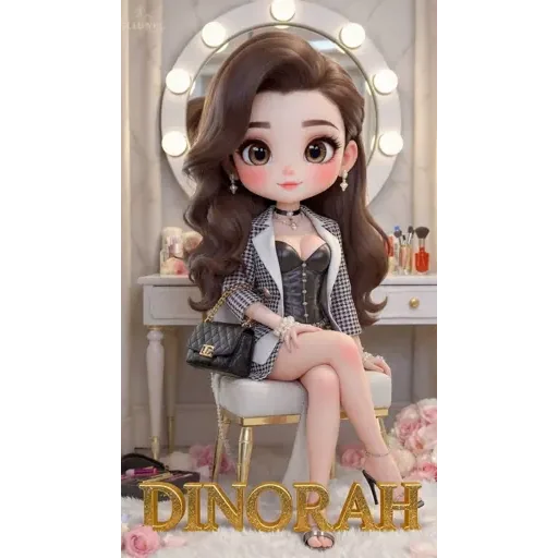 Uma boneca de estilo cartoon sentada em frente a um espelho com luzes, vestindo um traje cinza e branco. Ela tem cabelos castanhos longos e o nome 'DINORAH' aparece em letras douradas na parte inferior.
