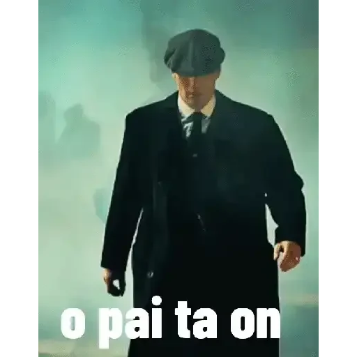 Um homem de terno preto e chapéu, com o texto 'o pai ta on' em branco na parte inferior.