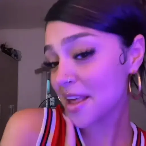 Uma mulher jovem com cabelo escuro, maquiagem pesada e um piercing no nariz. Ela está usando um top vermelho com listras brancas e pretas.