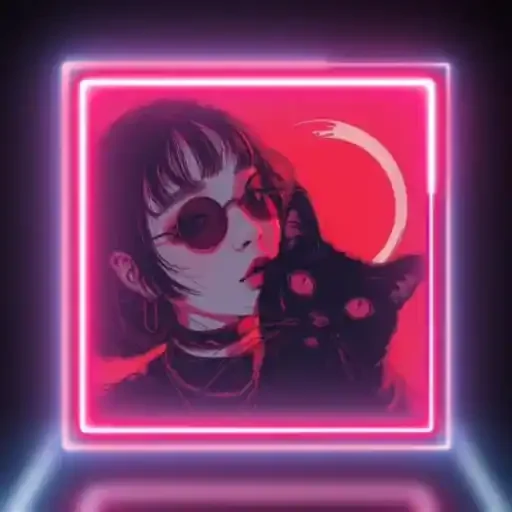 Uma ilustração de uma pessoa com franja e óculos de sol em um fundo rosa com um halo de luz neon. A imagem tem um quadro branco com efeito de luz.