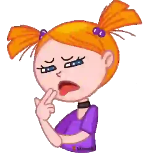 Menina de cabelo laranja em dois coques com expressão de desaprovação ou surpresa, vestindo uma blusa roxa e fazendo um gesto com a mão.